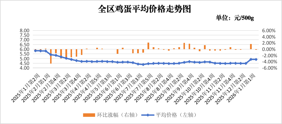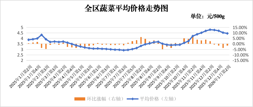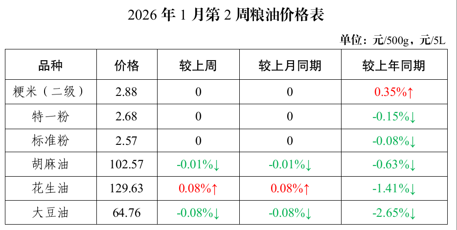 2026年1月5日-9日,全区监测的重要民生商品价格中,粮油价格基本稳定,蔬菜价格稳中有降,肉禽蛋价格略有波动,水果价格涨跌互现。具体情况如下: