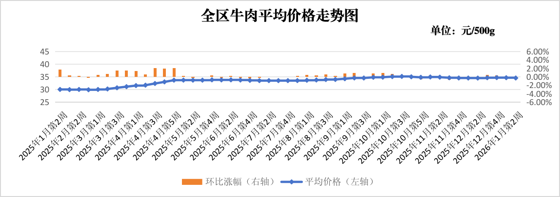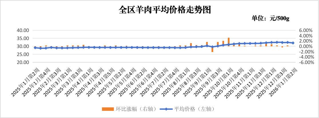 牛羊肉价格以稳为主。本周监测的鲜牛肉(腱子肉)价格为34.51元,较上周下降0.35%,较上月同期上涨0.09%,较上年同期上涨15.00%;鲜羊肉(新鲜带骨)价格为32.05元,较上周持平,较上月同期下降1.23%,较上年同期上涨10.27%。