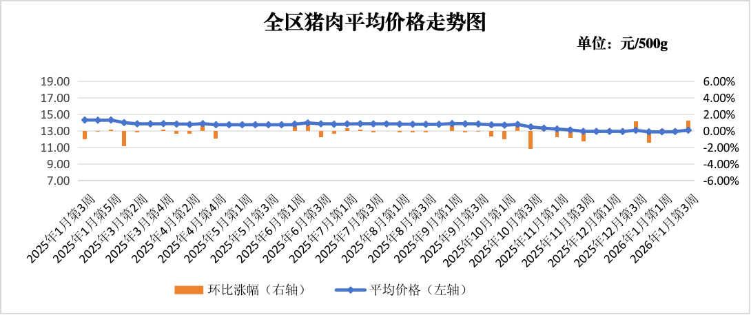 猪肉价格小幅上涨。本周监测的鲜猪肉(肋条肉)价格为13.06元,较上周上涨1.24%,较上月同期上涨0.08%,较上年同期下降8.59%。