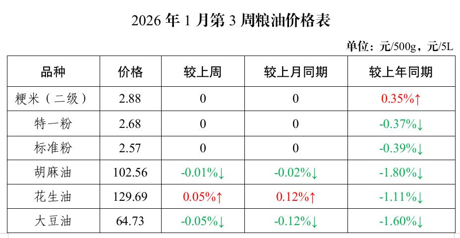 粮油价格保持平稳。本周粳米(平均每500克,下同)、特一粉、标准粉价格分别为2.88元、2.68元、2.57元,较上周、上月同期均持平;较上年同期粳米上涨0.35%,特一粉、标准粉分别下降0.37%、0.39%。胡麻油(桶装5升,下同)、花生油、大豆油价格分别为102.56元、129.69元、64.73元,较上周胡麻油、大豆油分别下降0.01%、0.05%,花生油上涨0.05%;较上月同期胡麻油、大豆油分别下降0.02%、0.12%,花生油上涨0.12%;较上年同期分别下降1.80%、1.11%和1.60%。