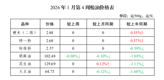 粮油价格基本稳定。本周粳米(平均每500克,下同)、特一粉、标准粉价格分别为2.88元、2.68元、2.57元,较上周、上月同期均持平;较上年同期粳米、特一粉分别上涨0.35%、0.37%,标准粉下降0.39%。胡麻油(桶装5升,下同)、花生油、大豆油价格分别为102.48元、129.69元、64.73元,较上周胡麻油下降0.08%,花生油、大豆油均持平;较上月同期胡麻油、大豆油分别下降0.10%、0.12%,花生油上涨0.12%;较上年同期分别下降1.88%、1.11%和1.60%。