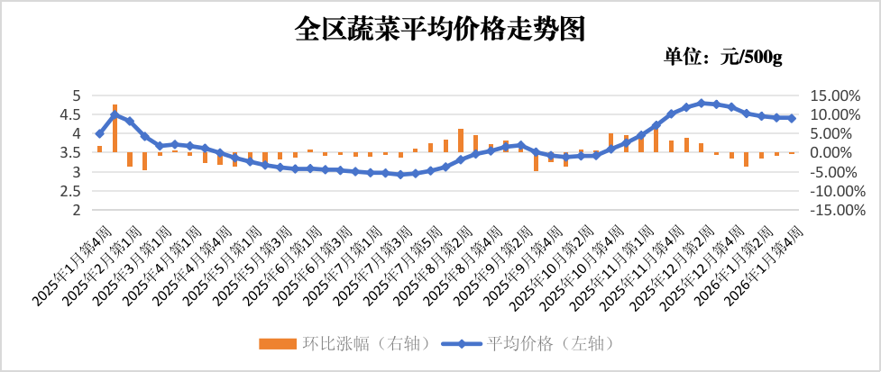 2026年1月19日-23日,全区监测的重要民生商品价格中,粮油价格基本稳定,蔬菜价格稳中微降,肉禽蛋价格略有波动,水果价格以降为主。具体情况如下: