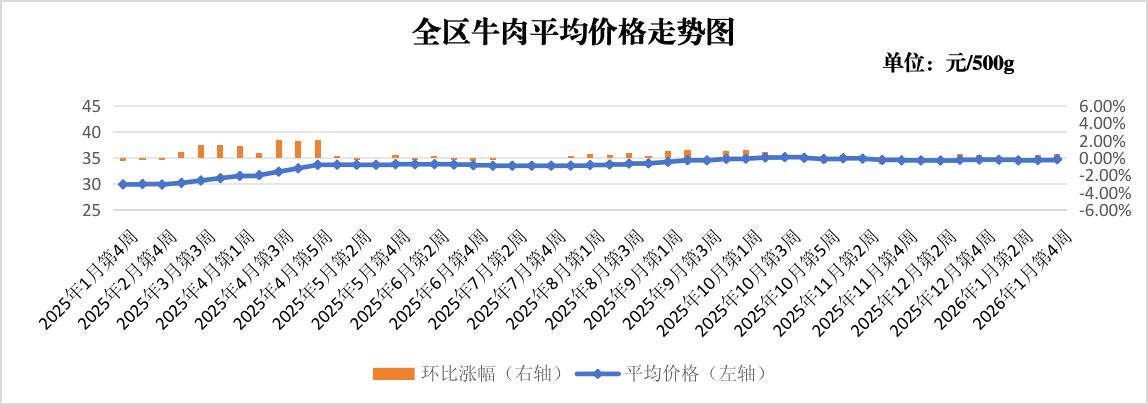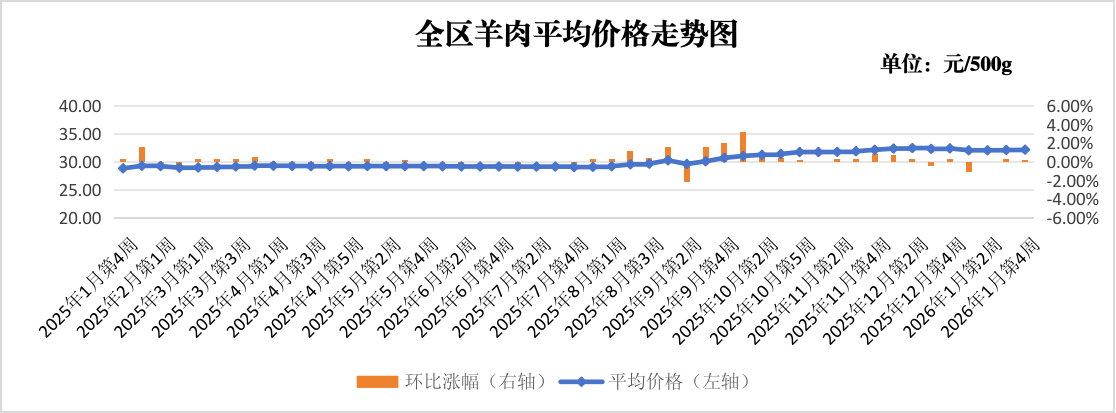 牛羊肉价格微幅上涨。本周监测的鲜牛肉(腱子肉)价格为34.72元,较上周上涨0.46%,较上月同期上涨0.17%,较上年同期上涨16.13%;鲜羊肉(新鲜带骨)价格为32.16元,较上周上涨0.19%,较上月同期下降0.71%,较上年同期上涨11.56%。