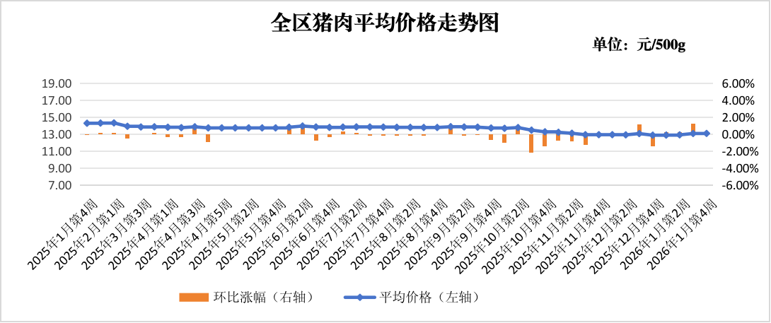 猪肉价格略有上涨。本周监测的鲜猪肉(肋条肉)价格为13.07元,较上周上涨0.08%,较上月同期上涨1.63%,较上年同期下降8.40%。