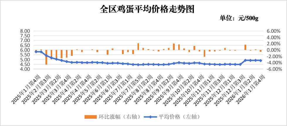 禽蛋价格微幅下降。本周鸡蛋市场价格稳中微降,监测的价格为4.88元,较上周下降0.61%,较上月同期上涨1.04%,较上年同期下降16.06%;鸡肉(白条鸡)价格为11.00元,较上周下降0.18%,较上月同期下降0.99%,较上年同期上涨1.21%。