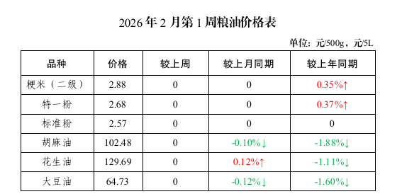 粮油价格基本稳定。本周粳米(平均每500克,下同)、特一粉、标准粉价格分别为2.88元、2.68元、2.57元,较上周、上月同期均持平;较上年同期粳米、特一粉分别上涨0.35%、0.37%,标准粉持平。胡麻油(桶装5升,下同)、花生油、大豆油价格分别为102.48元、129.69元、64.73元,较上周均持平;较上月同期胡麻油、大豆油分别下降0.10%、0.12%,花生油上涨0.12%;较上年同期分别下降1.88%、1.11%和1.60%。