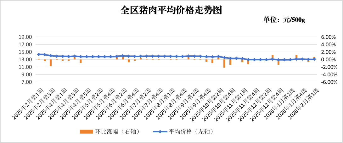 猪肉价格稳中微涨。本周监测的鲜猪肉(肋条肉)价格为13.06元,较上周上涨0.62%,较上月同期上涨1.48%,较上年同期下降8.71%。