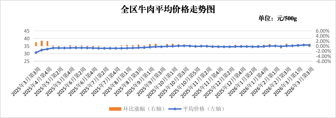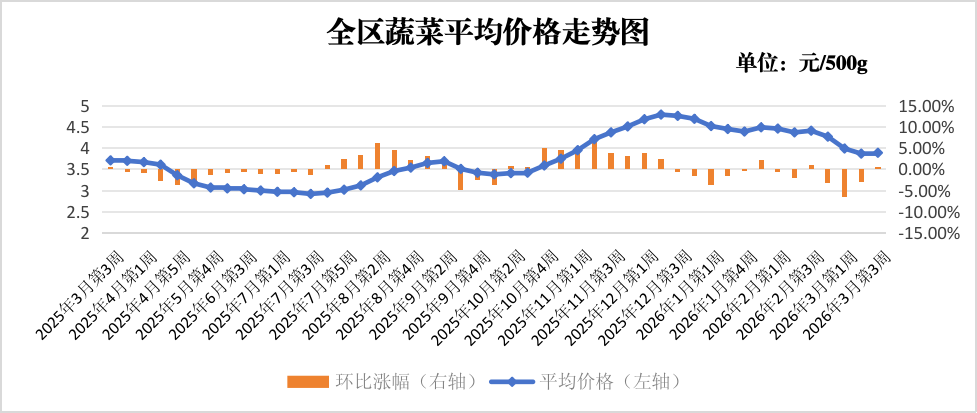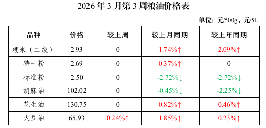 2026年3月16日-20日,全区监测的重要民生商品价格中,粮油价格保持平稳,蔬菜价格稳中微涨,肉禽蛋价格微幅波动,水果价格涨跌互现。具体情况如下: