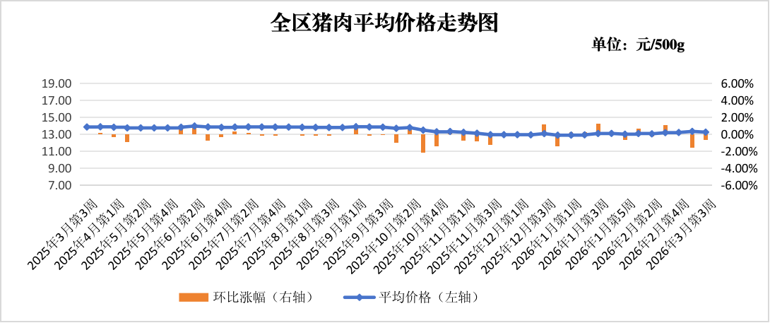 猪肉价格略有下降。本周监测的鲜猪肉(肋条肉)价格为13.22元,较上周下降0.68%,较上月同期上涨0.46%,较上年同期下降4.41%。
